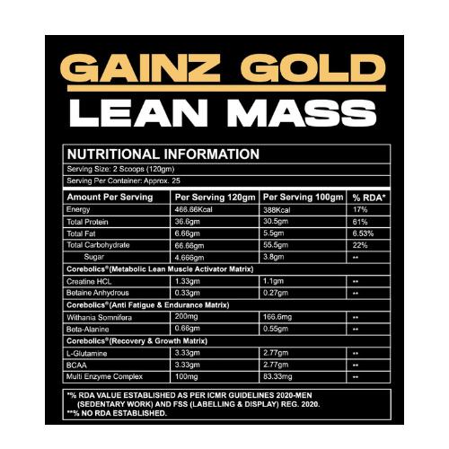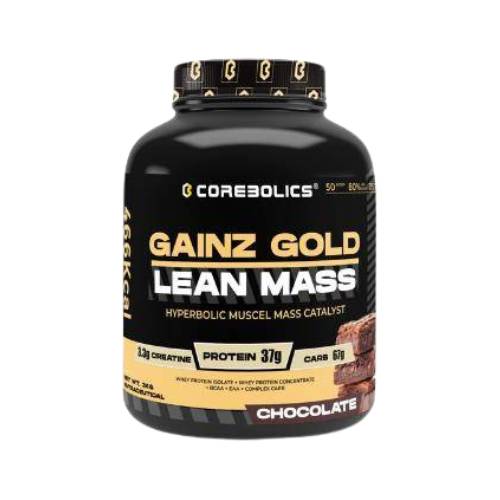 Corebolics Gainz Gold Lean Mass is a premium lean mass gainer designed to support muscle growth, recovery, and overall performance. With its balanced macronutrient profile, added creatine, and clean formulation, it serves as an excellent choice for individuals aiming to enhance their physique and athletic capabilities. Incorporate Gainz Gold into your nutrition plan to support your muscle-building journey effectively.