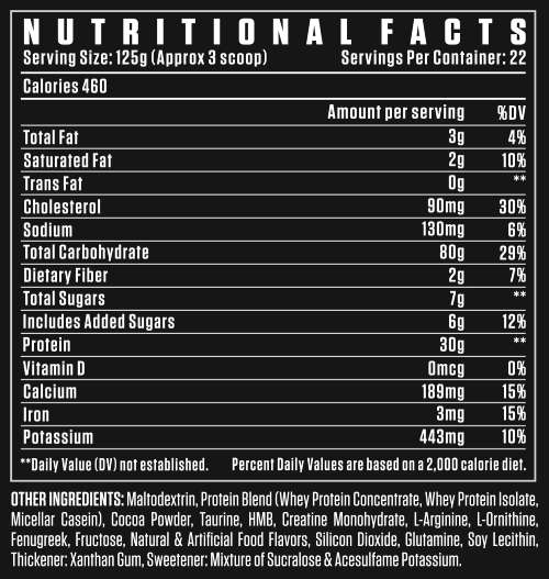 • Over 1,250 calories and 250g of carbs per serving to support mass gain